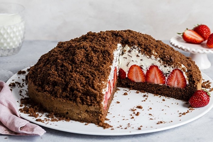 8. Na jahody naneseme šlehačkový krém do kopečka, a kopeček obsypeme drobky z korpusu.
