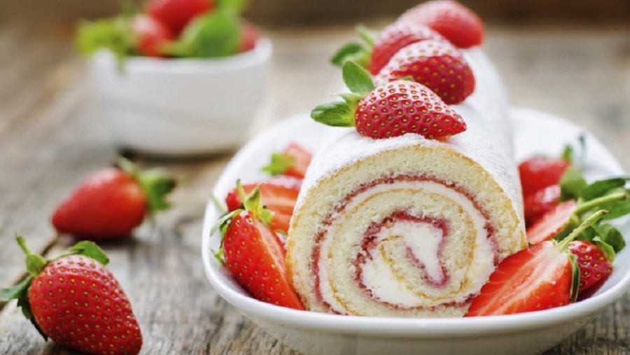 5. Roládu servírujeme pomoučenou cukrem a ozdobenou jahodami.